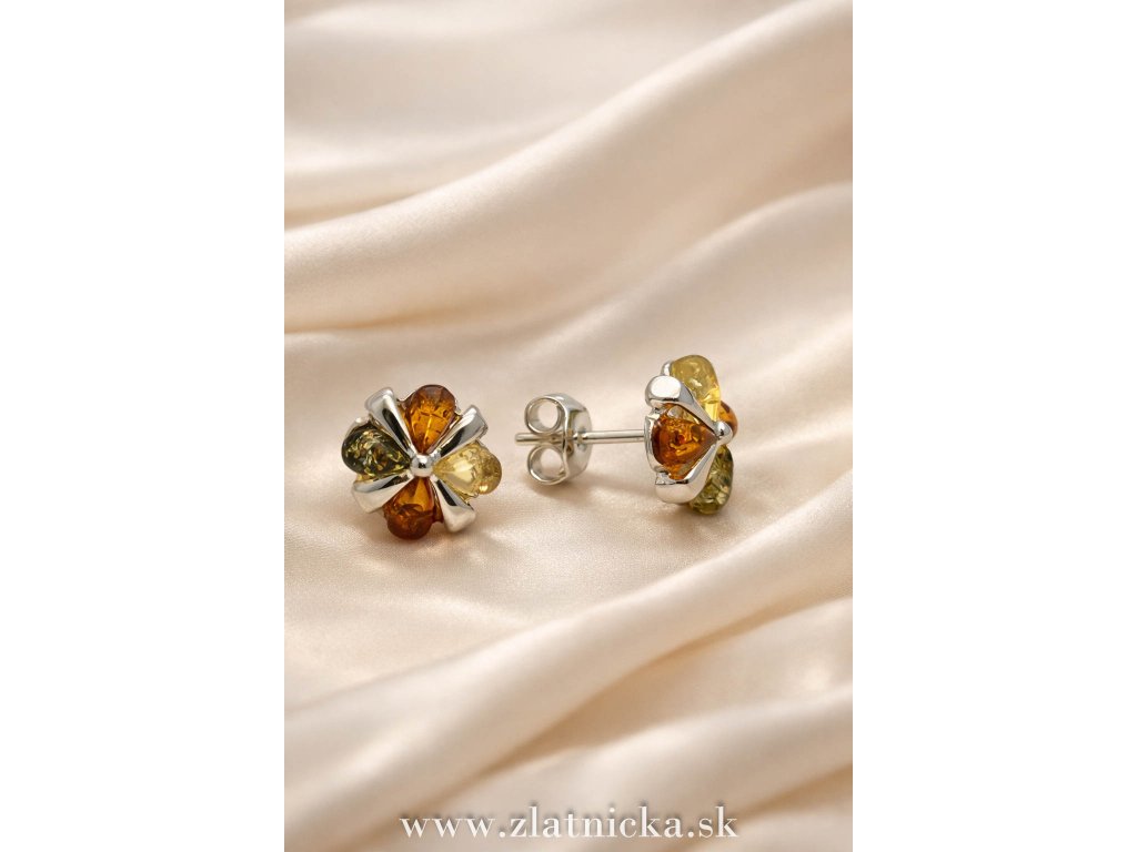 Strieborné náušnice s prírodným jantárom – elegantný kvetový motív