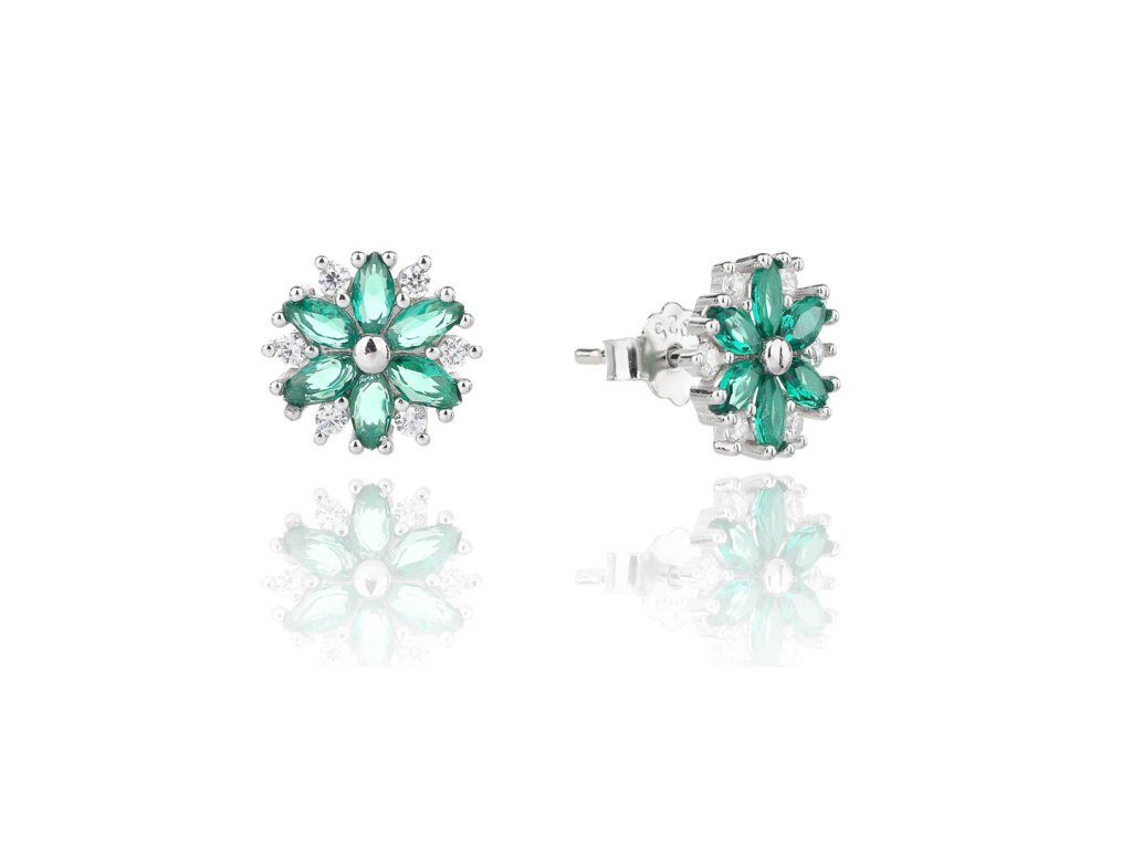 Tieto pôvabné strieborné náušnice v tvare kvetu zaujmú svojím sviežim dizajnom a žiarivými zirkónmi. Šesť zelených marquise brúsených zirkónov tvorí lístky kvetu, pričom každý je doplnený čírymi drobnými zirkónmi, ktoré vytvárajú dojem trblietavého rámu. Náušnice sú vyrobené zo striebra s rýdzosťou 925/1000 a opatrené puzetovým zapínaním pre pohodlné a bezpečné nosenie.