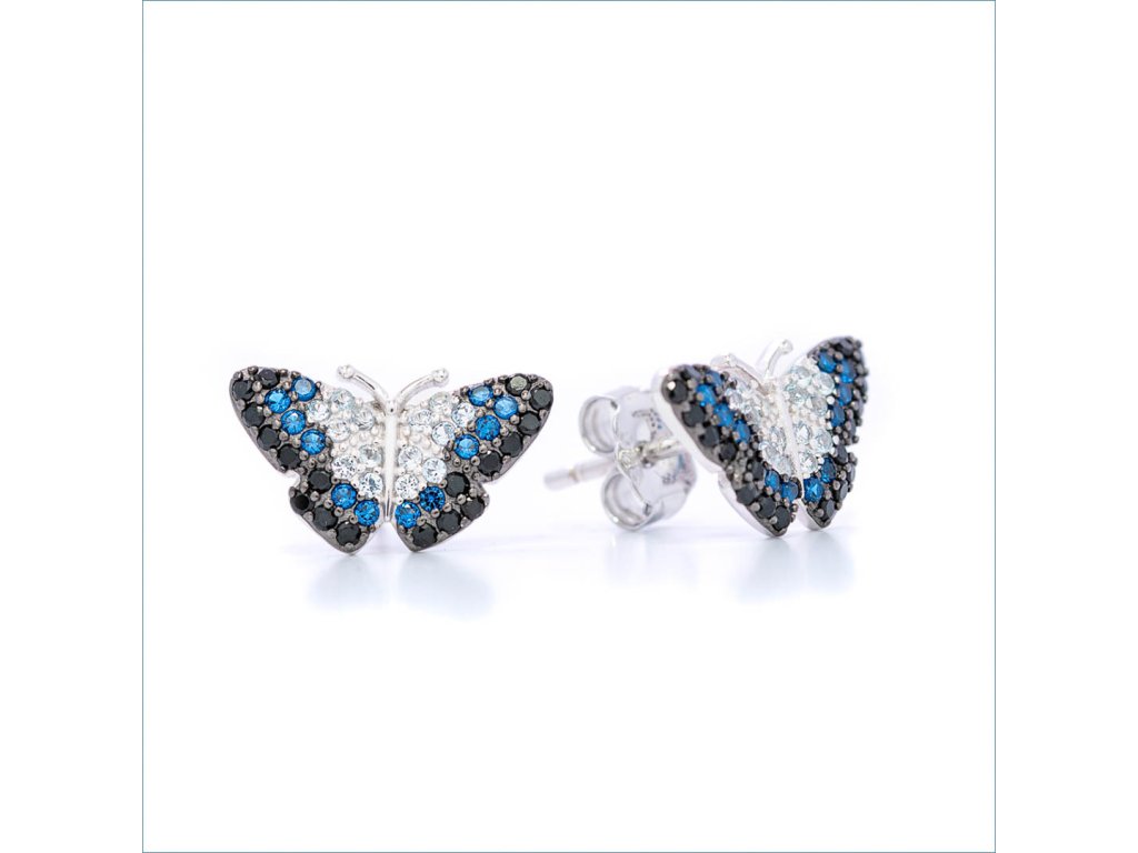 Strieborné náušnice – motýľ, číre, modré a čierne zirkóny, rhódiované striebro 925