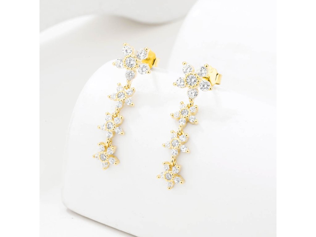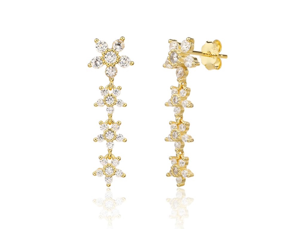 Strieborné pozlátené visiace náušnice zdobené čírymi zirkónmi v tvare kvetov.