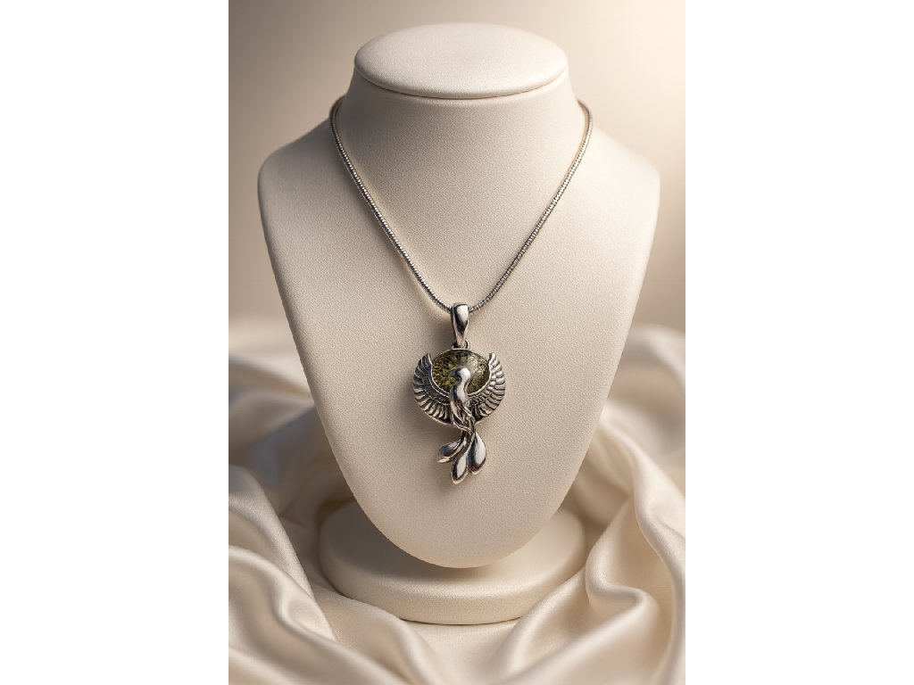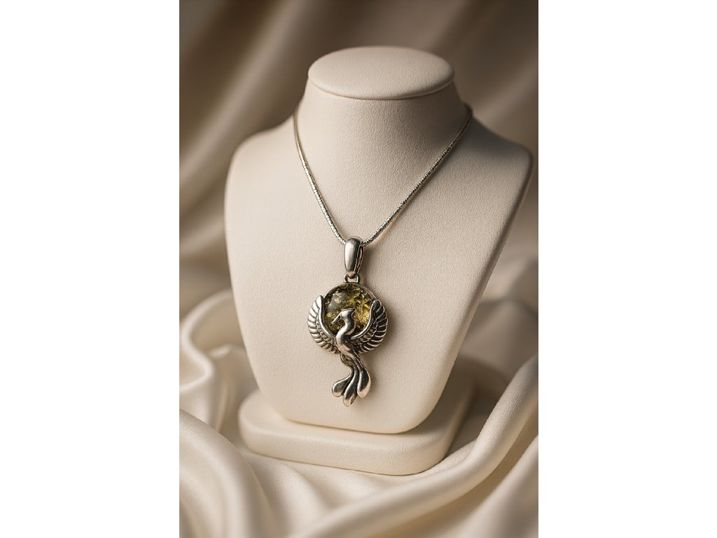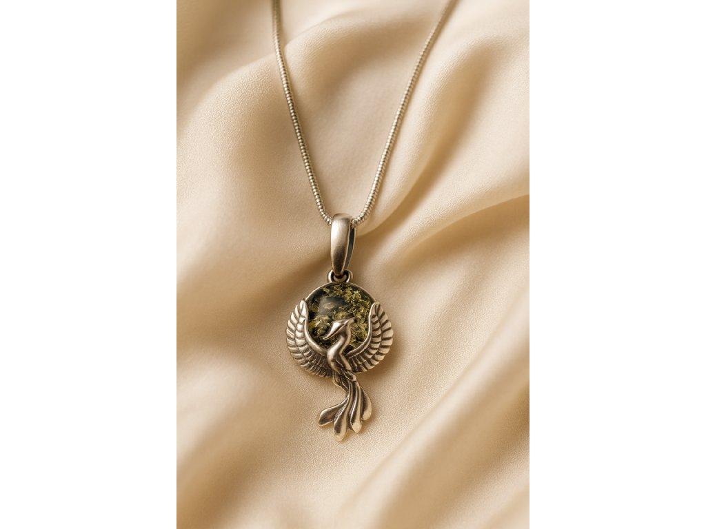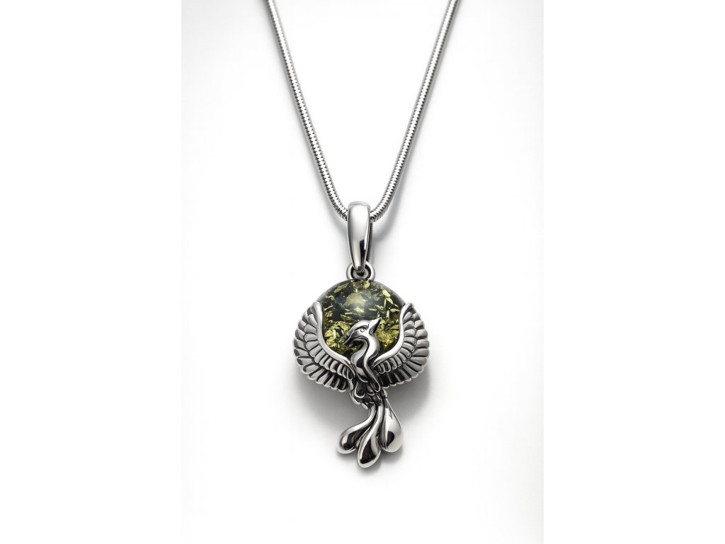 Strieborný jantárový prívesok Fénix, zelený jantár