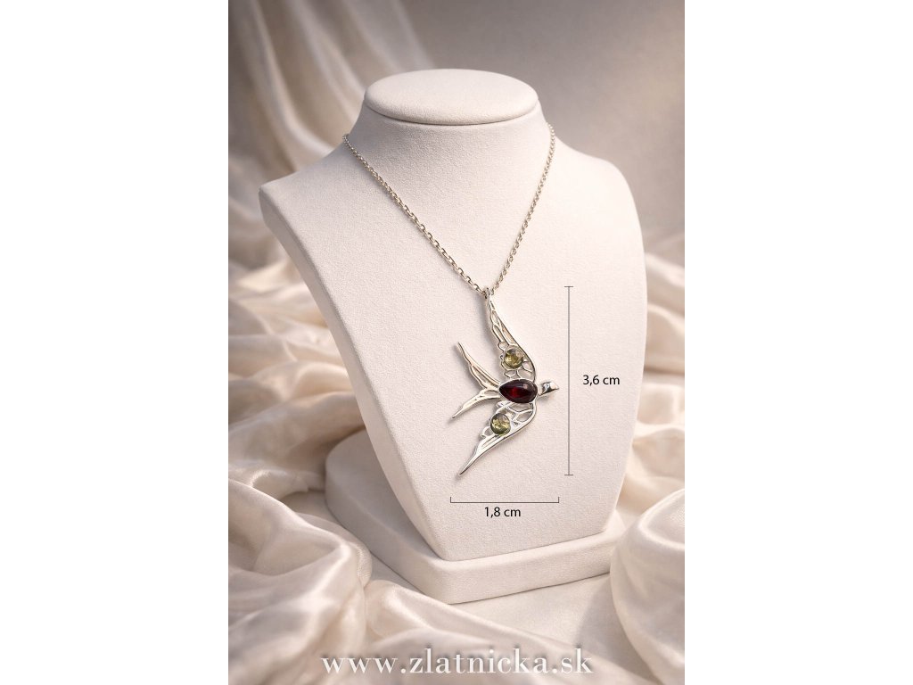 Strieborný prívesok v tvare lastovičky vyrobený zo striebra 925/1000 je zdobený prírodným jantárom, ktorý je cenený pre svoju jedinečnú farbu a prirodzený pôvod. Precízne spracovanie zvýrazňuje jemné línie motívu a zabezpečuje elegantný vzhľad vhodný na každodenné nosenie.